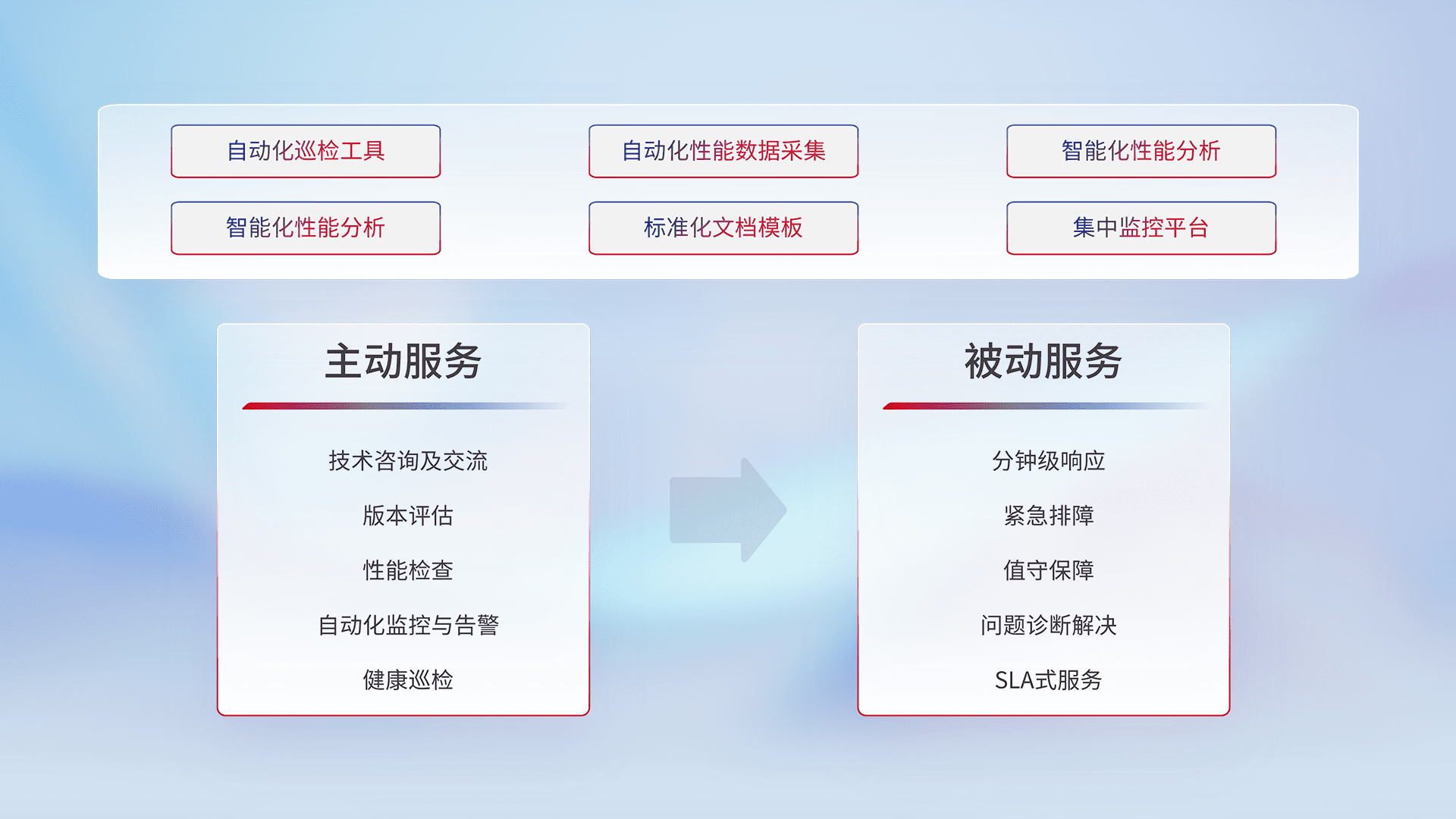 智能化工具和标准化文档,,,保障服务质量,,提供主动服务(包含技术咨询、、、、版本评估、、、性能检查、、、自动化监控与告警、、、、健康巡检)和被动服务包含(分钟级响应、、、紧急排障、、、、值守保障、、、、问题诊断解决、、、、SLA服务)。。。
